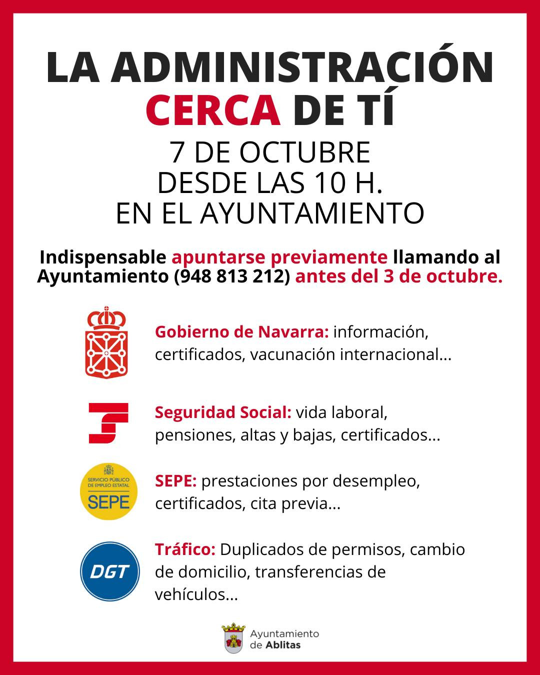 El próximo martes 7 de octubre, el servicio itinerante de 'La Administración cerca de ti' estará en Ablitas para facilitar diferentes trámites y gesti...
