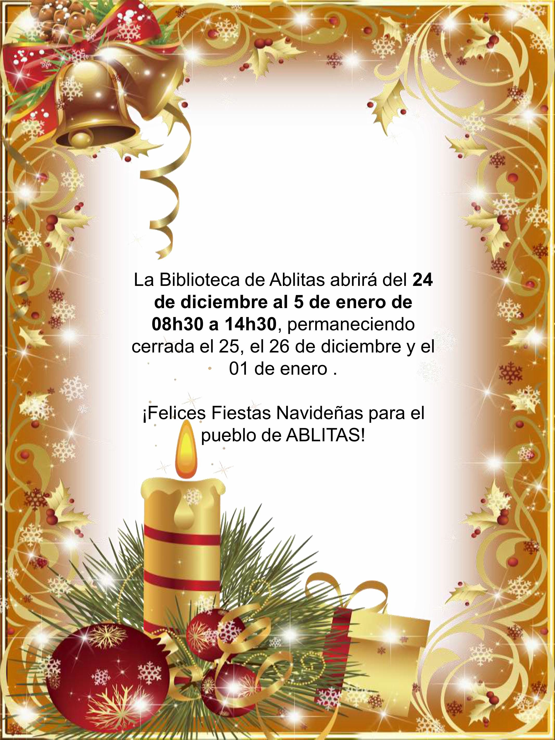 La Biblioteca de Ablitas abrirá del 24 de diciembre al 5 de enero de 08h30 a 14h30, permaneciendo cerrada el 25, el 26 de diciembre y el 01 de enero....