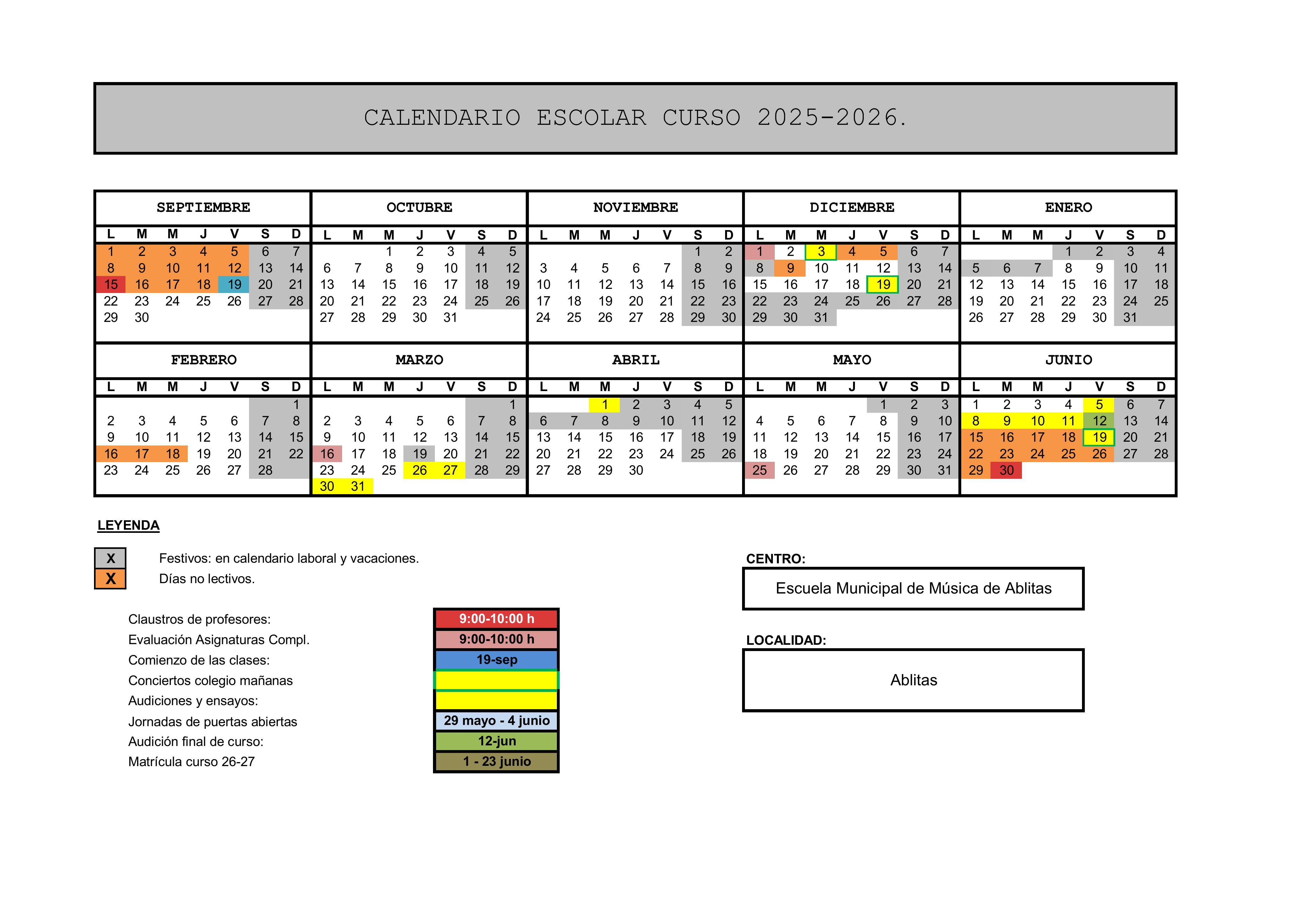 ESCUELA DE MÚSICA: CALENDARIO ESCOLAR