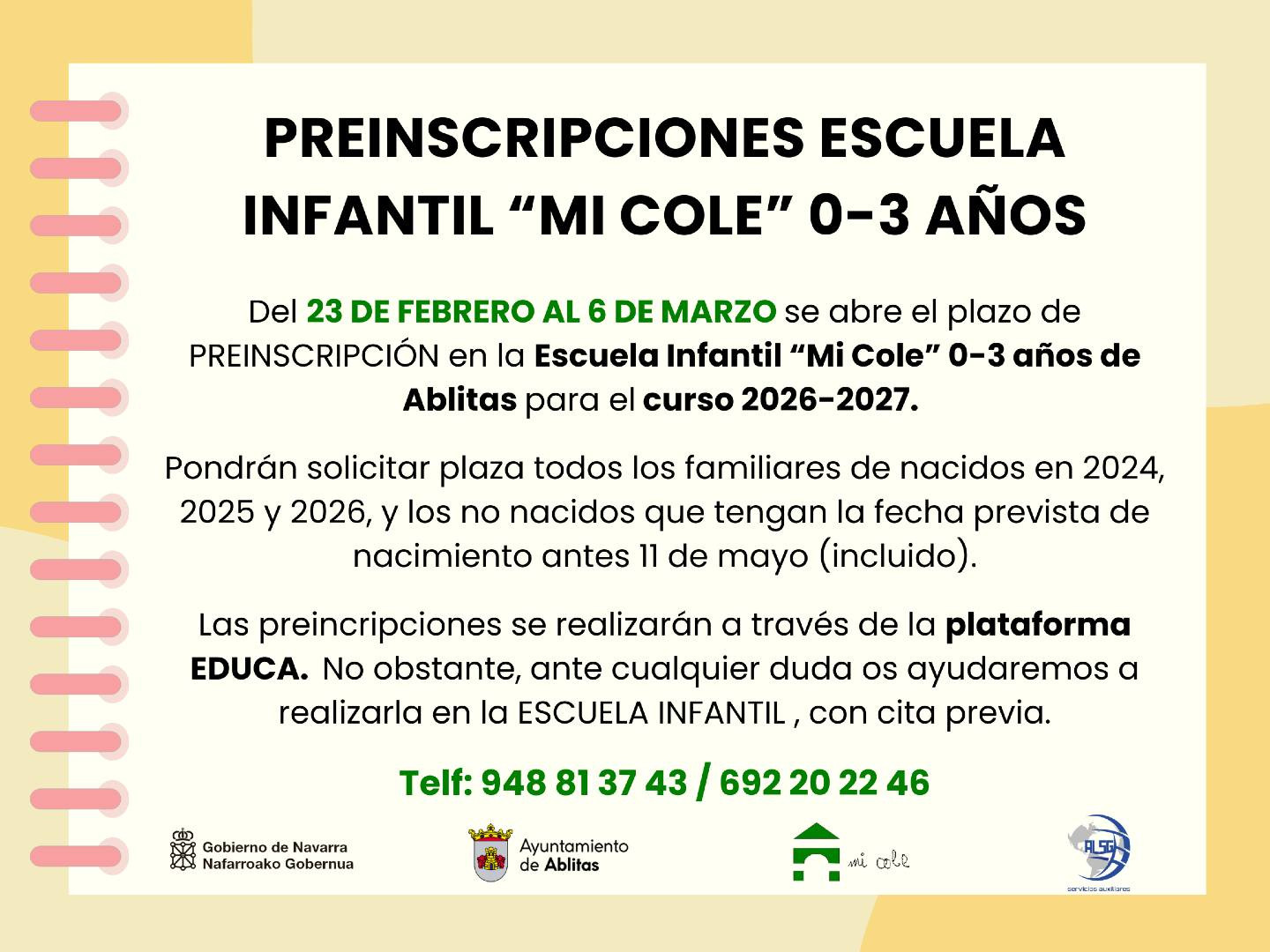 Se acerca el periodo de preinscripción para la Escuela Infantil "Mi Cole" (0-3 años) de cara al próximo curso 2026-2027. ¡Ve guardando las fechas!