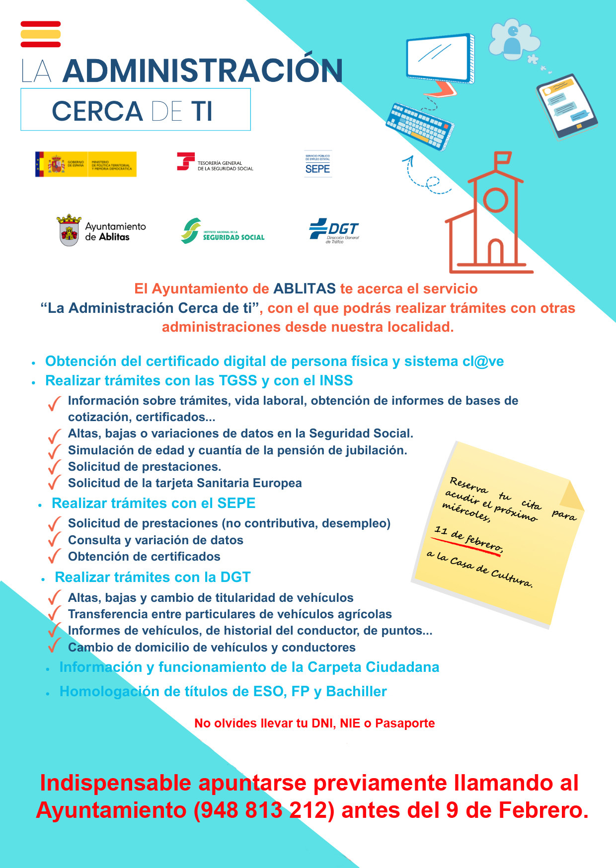 Trámites con otras administraciones desde Ablitas. Próximo servicio: miércoles, 11 de febrero, en la Casa de Cultura. Inscripciones antes del 9 de febrero en el 948 813 212