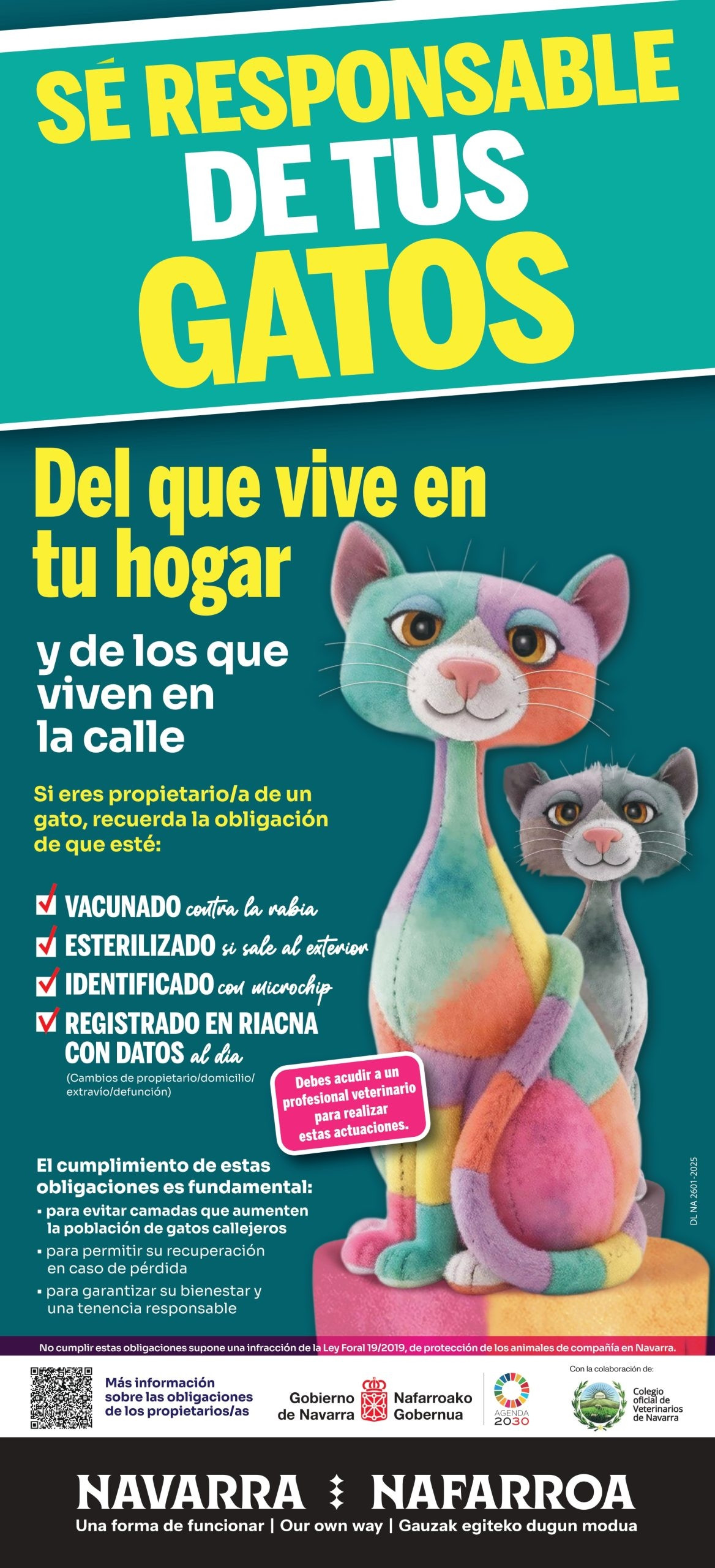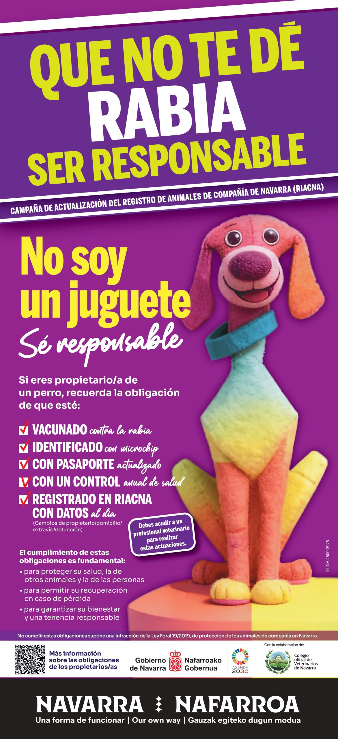 La iniciativa recuerda a las personas propietarias de perros la obligación de mantener a sus animales vacunados contra la rabia, identificados con microchip, con pasaporte actualizado y con un control anual de salud. Además, deben estar inscritos en el RIACNA —Registro de Identificación de Animales de Compañía de Navarra— con los datos al día, incluyendo posibles cambios de domicilio o propietario, así como notificaciones por extravío o fallecimiento.