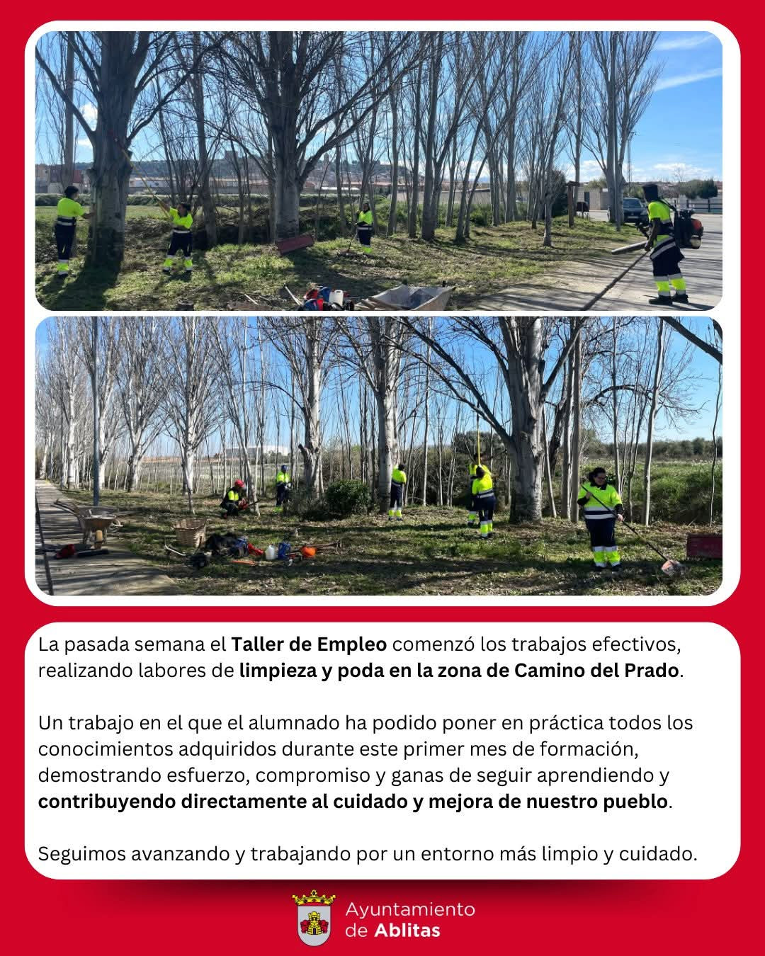 La pasada semana el alumnado del Taller de Empleo de Ablitas ha comenzado los trabajos prácticos con labores de limpieza y poda en la zona de Camino del Prado.